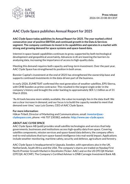 AAC Clyde Space today publishes its Annual Report for 2025. The year marked a third consecutive year of positive EBITDA and continued growth in the Data & Services segment. The company continues to invest in its capabilities and operates in a market with strong and growing demand for space systems and space-based data.