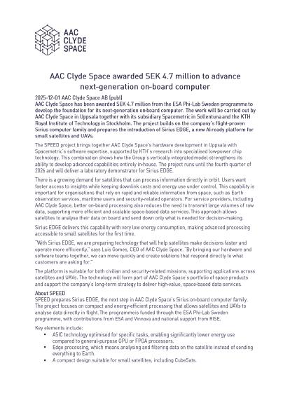 The SPEED project brings together AAC Clyde Space's hardware development in Uppsala with Spacemetric's software expertise, supported by KTH's research into specialised low-power chip technology. This combination shows how the Group's vertically integrated model strengthens its ability to develop advanced capabilities entirely in-house. The project runs until the fourth quarter of 2026 and will deliver a laboratory demonstrator for Sirius EDGE.