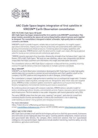 "VIREON connects every part of our business, showing the strength of our full value chain," says Luis Gomes, CEO of AAC Clyde Space. "We build our own satellites, use our own components, and deliver unique data that helps customers turn information into insight and make better decisions."