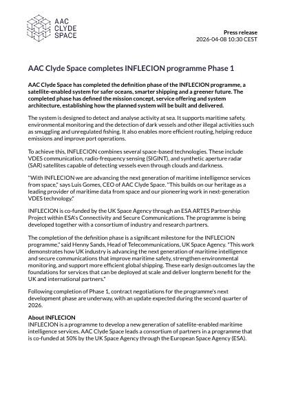 "With INFLECION we are advancing the next generation of maritime intelligence services from space," says Luis Gomes, CEO of AAC Clyde Space. "This builds on our heritage as a leading provider of maritime data from space and our pioneering work in next-generation VDES technology."