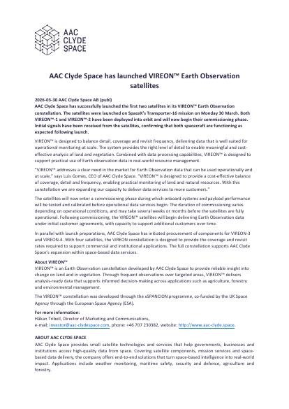AAC Clyde Space is headquartered in Uppsala, Sweden, with operations also in the UK, Netherlands, South Africa and the USA. The company's shares are traded on Nasdaq First North Premier Growth Market in Stockholm (Ticker: AAC) and on the US OTCQX Market (OTCQX: ACCMF). The Company's Certified Adviser is DNB Carnegie Investment Bank AB.