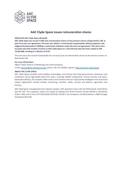 AAC Clyde Space has issued 17,092 new remuneration shares to the previous owners of Spacemetric AB, as part of an earn-out agreement. The earn-out, which is a stock based compensation without payment, was triggered by Spacemetric fulfilling a contractual milestone under the earn-out agreement. This share issue increases the total number of shares in AAC Clyde Space to 7,132,744 and raise the share capital to SEK 14,265,488, resulting in a dilution of 0.2%.