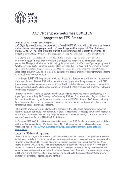"This update provides welcome clarity on the progress of the EPS-Sterna programme. The Arctic Weather Satellite continues to perform well in orbit, validating the technology on which the mission is based. We look forward to supporting the programme as it advances through ESA's procurement process," says Luis Gomes, CEO of AAC Clyde Space.