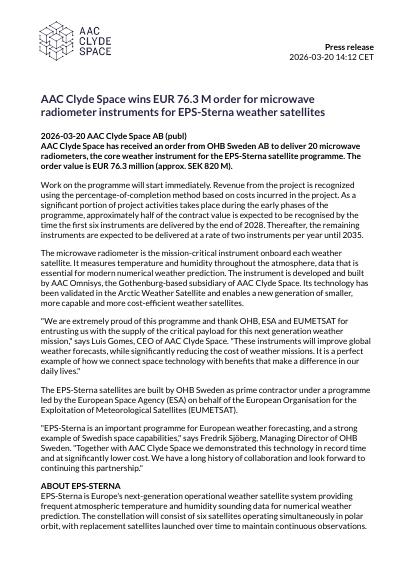 This information is information that AAC Clyde Space AB is obliged to make public pursuant to the EU Market Abuse Regulation. The information was submitted for publication, through the agency of the contact person(s) set out above, at 2026-03-20 14:12 CET.