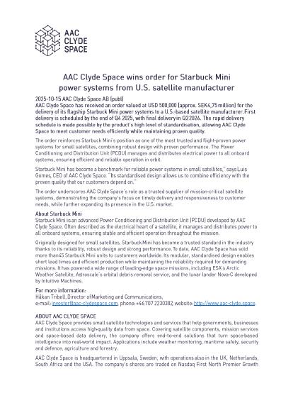 AAC Clyde Space has received an order valued at USD 500,000 (approx. SEK 4,75 million) for the delivery of its flagship Starbuck Mini power systems to a U.S.-based satellite manufacturer. First delivery is scheduled by the end of Q4 2025, with final delivery in Q2 2026. The rapid delivery schedule is made possible by the product's high level of standardisation, allowing AAC Clyde Space to meet customer needs efficiently while maintaining proven quality.