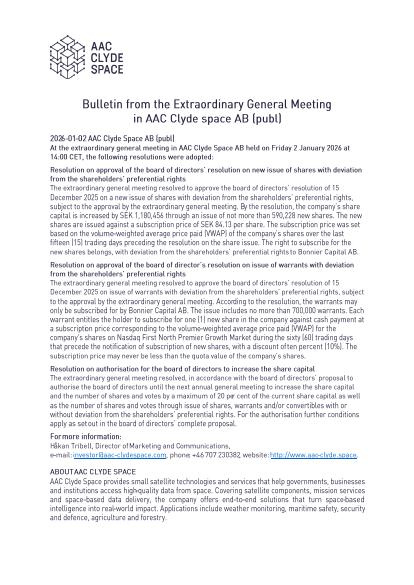 At the extraordinary general meeting in AAC Clyde Space AB held on Friday 2 January 2026 at 14:00 CET, the following resolutions were adopted: