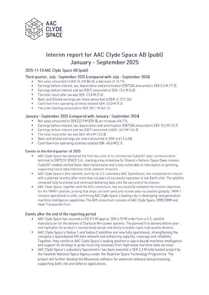 Interim report for AAC Clyde Space AB (publ) January - September 2025