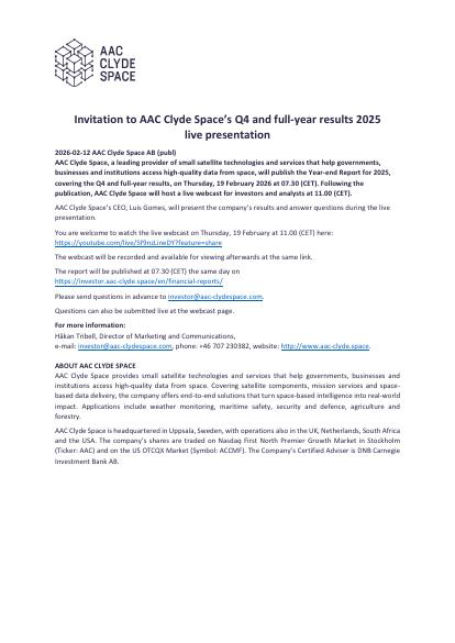 AAC Clyde Space, a leading provider of small satellite technologies and services that help governments, businesses and institutions access high-quality data from space, will publish the Year-end Report for 2025, covering the Q4 and full-year results, on Thursday, 19 February 2026 at 07.30 (CET). Following the publication, AAC Clyde Space will host a live webcast for investors and analysts at 11.00 (CET).