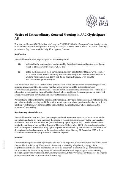 The shareholders of AAC Clyde Space AB, reg. no. 556677-0599 (the "Company"), are hereby invited to attend the extraordinary general meeting on Friday 2 January 2026 at 14:00 CET at the Company's premises at Dag Hammarskjölds väg 48 in Uppsala, Sweden.