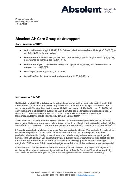 Denna information är sådan information som Absolent Air Care Group AB (publ) är skyldigt att offentliggöra enligt EU:s marknadsmissbruksförordning. Informationen lämnades, genom ovanstående kontaktpersons försorg, för offentliggörande den 29 april 2026 kl. 10:00 CEST.