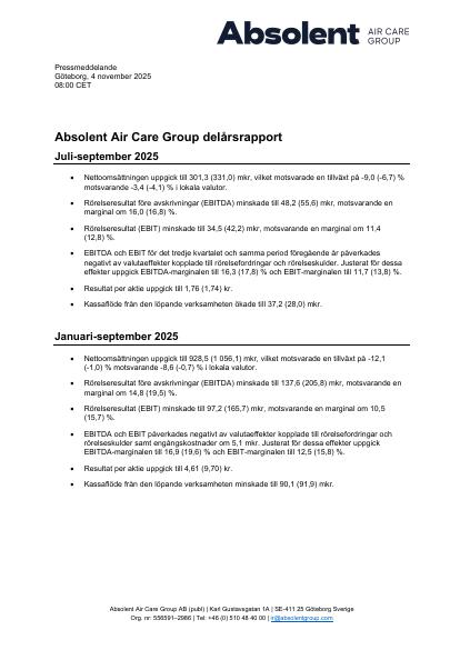 Denna information är sådan information som Absolent Air Care Group AB (publ) är skyldigt att offentliggöra enligt EU:s marknadsmissbruksförordning. Informationen lämnades, genom ovanstående kontaktpersons försorg, för offentliggörande den 4 november 2025 kl. 08:00 CET.