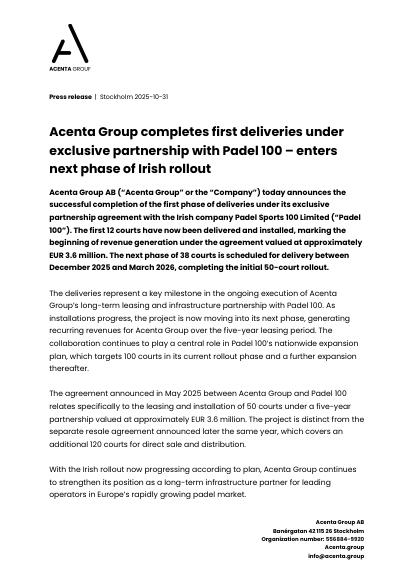 Acenta Group AB ("Acenta Group" or the "Company") today announces the successful completion of the first phase of deliveries under its exclusive partnership agreement with the Irish company Padel Sports 100 Limited ("Padel 100"). The first 12 courts have now been delivered and installed, marking the beginning of revenue generation under the agreement valued at approximately EUR 3.6 million. The next phase of 38 courts is scheduled for delivery between December 2025 and March 2026, completing the initial 50-court rollout.