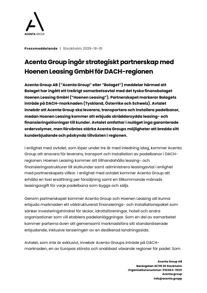 Acenta Group AB ("Acenta Group" eller "Bolaget") meddelar härmed att Bolaget har ingått ett treårigt samarbetsavtal med det tyska finansbolaget Hoenen Leasing GmbH ("Hoenen Leasing"). Partnerskapet markerar Bolagets inträde på DACH-marknaden (Tyskland, Österrike och Schweiz). Avtalet innebär att Acenta Group ska leverera, transportera och installera padelbanor, medan Hoenen Leasing kommer att erbjuda skräddarsydda leasing- och finansieringslösningar till kunder. Avtalet omfattar i nuläget inga garanterade ordervolymer, men förväntas stärka Acenta Groups möjligheter att bredda sitt kunderbjudande och påskynda tillväxten i regionen.