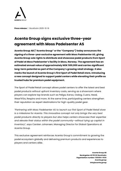 Acenta Group AB ("Acenta Group" or the "Company") today announces the signing of a three-year exclusive agreement with Moss Padelsenter AS, giving Acenta Group sole rights to distribute and showcase padel products from Sport of Padel at Moss Padelsenter's facility in Moss, Norway. The agreement has an estimated annual value of approximately NOK 500,000 and carries significant long-term potential as part of the Company's growing retail strategy. It also marks the launch of Acenta Group's first Sport of Padel Retail store, introducing a new concept designed to support padel centers while elevating their profile as trusted hubs for premium padel equipment.