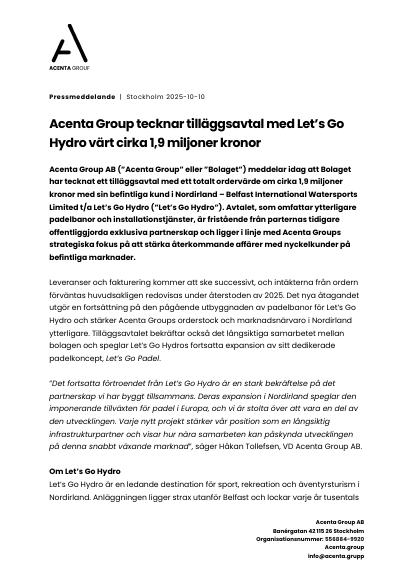Acenta Group AB ("Acenta Group" eller "Bolaget") meddelar idag att Bolaget har tecknat ett tilläggsavtal med ett totalt ordervärde om cirka 1,9 miljoner kronor med sin befintliga kund i Nordirland - Belfast International Watersports Limited t/a Let's Go Hydro ("Let's Go Hydro"). Avtalet, som omfattar ytterligare padelbanor och installationstjänster, är fristående från parternas tidigare offentliggjorda exklusiva partnerskap och ligger i linje med Acenta Groups strategiska fokus på att stärka återkommande affärer med nyckelkunder på befintliga marknader.