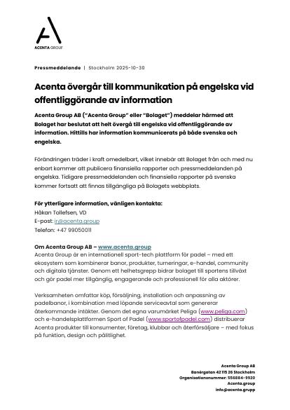 Acenta Group AB ("Acenta Group" eller "Bolaget") meddelar härmed att Bolaget har beslutat att helt övergå till engelska vid offentliggörande av information. Hittills har information kommunicerats på både svenska och engelska.