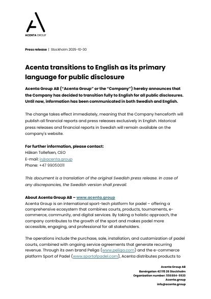 Acenta Group AB ("Acenta Group" or the "Company") hereby announces that the Company has decided to transition fully to English for all public disclosures. Until now, information has been communicated in both Swedish and English.