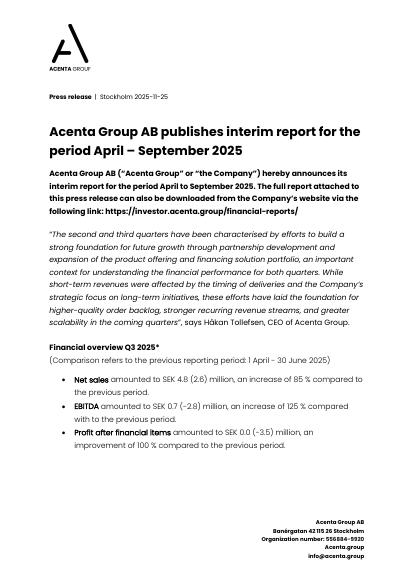 Acenta Group AB ("Acenta Group" or "the Company") hereby announces its interim report for the period April to September 2025. The full report attached to this press release can also be downloaded from the Company's website via the following link: https://investor.acenta.group/financial-reports/