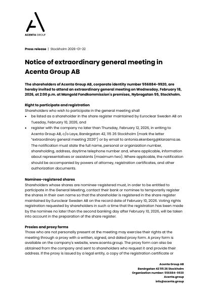 The shareholders of Acenta Group AB, corporate identity number 556884-9920, are hereby invited to attend an extraordinary general meeting on Wednesday, February 18, 2026, at 2:00 p.m. at Mangold Fondkommission's premises, Nybrogatan 55, Stockholm.