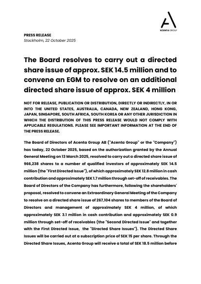 The Board of Directors of Acenta Group AB ("Acenta Group" or the "Company") has today, 22 October 2025, based on the authorization granted by the Annual General Meeting on 13 March 2025, resolved to carry out a directed share issue of 966,238 shares to a number of qualified investors of approximately SEK 14.5 million (the "First Directed Issue"), of which approximately SEK 12.8 million in cash contribution and approximately SEK 1.7 million through set-off of receivables. The Board of Directors of the Company has furthermore, following the shareholders' proposal, resolved to convene an Extraordinary General Meeting of the Company to resolve on a directed share issue of 267,104 shares to members of the Board of Directors and management of approximately SEK 4 million, of which approximately SEK 3.1 million in cash contribution and approximately SEK 0.9 million through set-off of receivables (the "Second Directed Issue" and together with the First Directed Issue, the "Directed Share Issues"). The Directed Share Issues will be carried out at a subscription price of SEK 15 per share. Through the Directed Share Issues, Acenta Group will receive a total of SEK 18.5 million before issue costs. Notice of the Extraordinary General Meeting will be published through a separate press release.