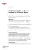 The shareholders of Adventure Box Technology AB (publ), Reg. No. 556963-6599 ("Adventure Box" or the "company"), are hereby summoned to the Annual General Meeting on Tuesday, 16 May 2023, 13:00 CEST, at SVEA's premises, Sveavägen 166, 113 46 Stockholm, Sweden.
