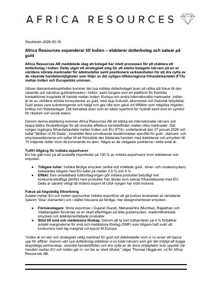 "Indien är en stor och strategiskt viktig marknad för guld och ädelmetaller som vi nu avser att öppna upp för affärer. Genom vårt nya dotterbolag etablerar vi en lokal närvaro som gör det möjligt att bygga långsiktiga partnerskap, utveckla handelsflöden och dra nytta av de stora möjligheter som uppstår när handeln mellan EU och Indien går in i en fas av stark tillväxt," säger Thomas Häggkvist, vd för Africa Resources AB.