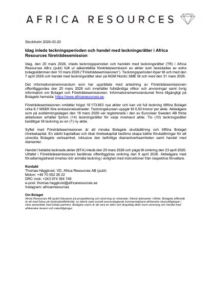 Idag, den 20 mars 2026, inleds teckningsperioden och handeln med teckningsrätter (TR) i Africa Resources AB:s (publ) fullt ut säkerställda företrädesemission av aktier som beslutades av extra bolagsstämman den 10 mars 2026 ("Företrädesemissionen"). Teckningsperioden löper till och med den 7 april 2026 och handel med teckningsrätter sker på NGM Nordic SME till och med den 31 mars 2026.