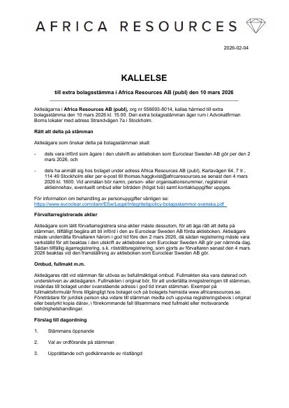 - Aktieägarna i Africa Resources AB (publ), org nr 556693-8014, kallas härmed till extra bolagsstämma den 10 mars 2026 kl. 15.00. Den extra bolagsstämman äger rum i Advokatfirman Borns lokaler med adress Strandvägen 7a i Stockholm.