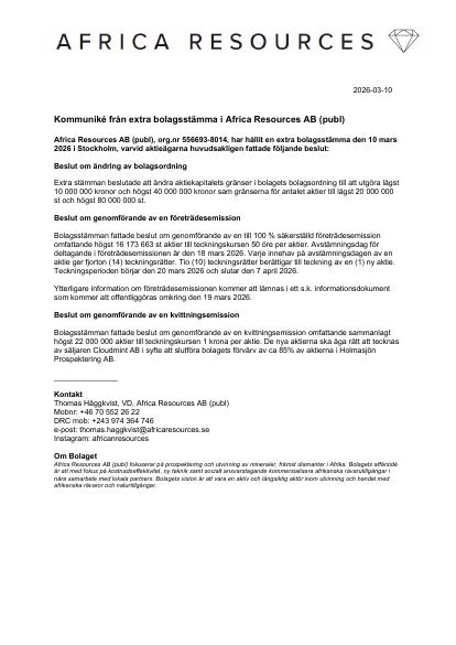 Africa Resources AB (publ), org.nr 556693-8014, har hållit en extra bolagsstämma den 10 mars 2026 i Stockholm, varvid aktieägarna huvudsakligen fattade följande beslut: