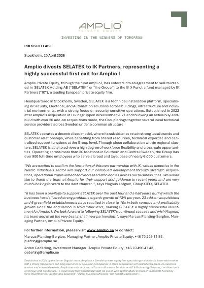 Amplio Private Equity, through the fund Amplio I, has entered into an agreement to sell its interest in SELATEK Holding AB ("SELATEK" or "the Group") to the IK X Fund, a fund managed by IK Partners ("IK"), a leading European private equity firm.