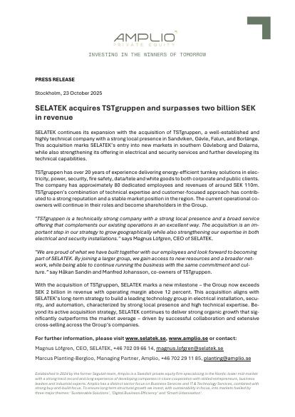 "We are proud of what we have built together with our employees and look forward to becoming part of SELATEK. By joining a larger group, we gain access to new resources and a broader network, while being able to continue running the business with the same commitment and culture." say Håkan Sandin and Manfred Johansson, co-owners of TSTgruppen.