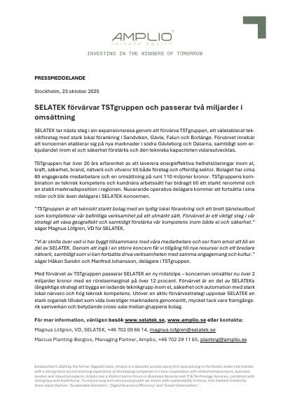 SELATEK förvärvar TSTgruppen och passerar två miljarder i omsättning