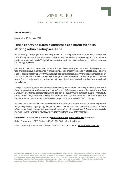 "Tedge is a growing player within sustainable energy systems, accelerating the energy transition through technical expertise and practical solutions. Kylmontage is a complete cooling and heat pump provider that performs installations and service assignments with high quality - making it a strong fit with Tedge's current offering. We see substantial opportunities for continued growth and development of the company within Tedge." says Oskar Oxenstierna, CEO of Tedge.