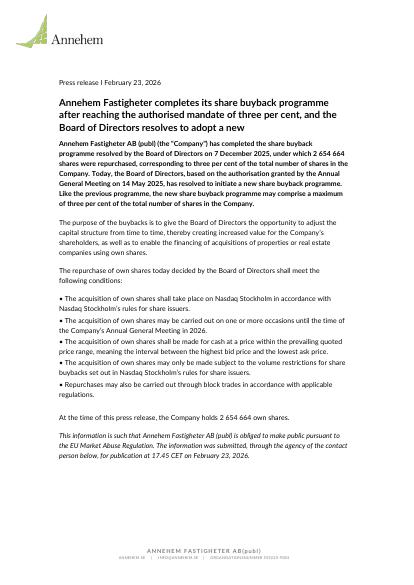 Annehem Fastigheter AB (publ) (the "Company") has completed the share buyback programme resolved by the Board of Directors on 7 December 2025, under which 2 654 664 shares were repurchased, corresponding to three per cent of the total number of shares in the Company. Today, the Board of Directors, based on the authorisation granted by the Annual General Meeting on 14 May 2025, has resolved to initiate a new share buyback programme. Like the previous programme, the new share buyback programme may comprise a maximum of three per cent of the total number of shares in the Company.