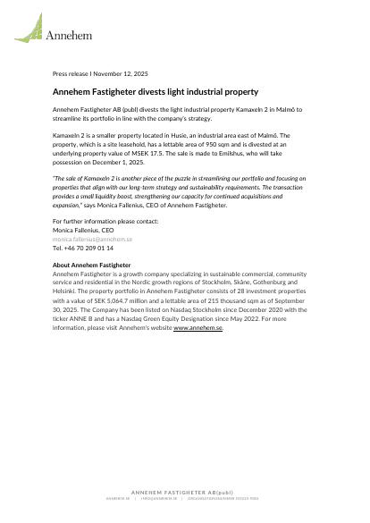 Annehem Fastigheter is a growth company specializing in sustainable commercial, community service and residential in the Nordic growth regions of Stockholm, Skåne, Gothenburg and Helsinki. The property portfolio in Annehem Fastigheter consists of 28 investment properties with a value of SEK 5,064.7 million and a lettable area of 215 thousand sqm as of September 30, 2025. The Company has been listed on Nasdaq Stockholm since December 2020 with the ticker ANNE B and has a Nasdaq Green Equity Designation since May 2022. For more information, please visit Annehem's website www.annehem.se.