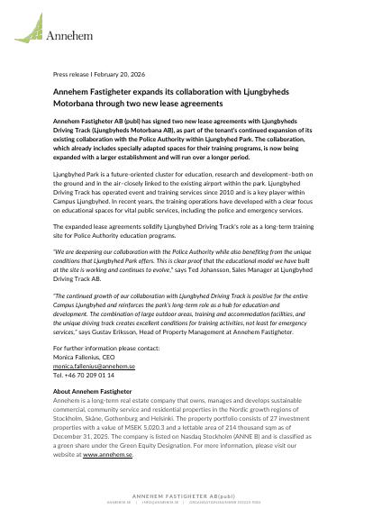 Annehem Fastigheter AB (publ) has signed two new lease agreements with Ljungbyheds Driving Track (Ljungbyheds Motorbana AB), as part of the tenant's continued expansion of its existing collaboration with the Police Authority within Ljungbyhed Park. The collaboration, which already includes specially adapted spaces for their training programs, is now being expanded with a larger establishment and will run over a longer period.