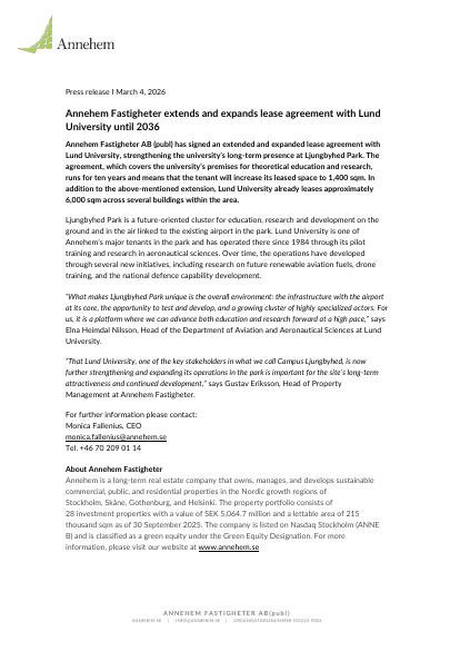 Annehem Fastigheter AB (publ) has signed an extended and expanded lease agreement with Lund University, strengthening the university's long-term presence at Ljungbyhed Park. The agreement, which covers the university's premises for theoretical education and research, runs for ten years and means that the tenant will increase its leased space to 1,400 sqm. In addition to the above-mentioned extension, Lund University already leases approximately 6,000 sqm across several buildings within the area.