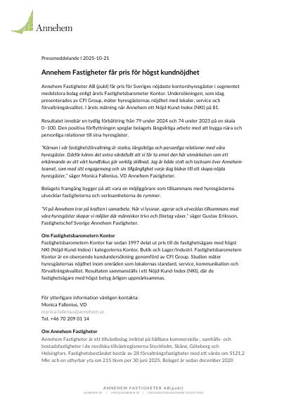 Annehem Fastigheter AB (publ) får pris för Sveriges nöjdaste kontorshyresgäster i segmentet medelstora bolag enligt årets Fastighetsbarometer Kontor. Undersökningen, som idag presenterades av CFI Group, mäter hyresgästernas nöjdhet med lokaler, service och förvaltningskvalitet. I årets mätning når Annehem ett Nöjd-Kund-Index (NKI) på 81.