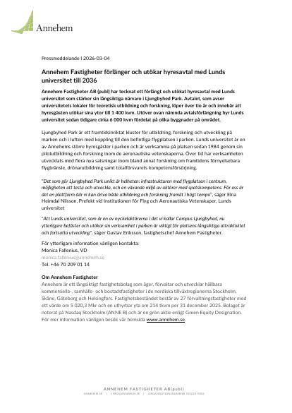 Annehem Fastigheter AB (publ) har tecknat ett förlängt och utökat hyresavtal med Lunds universitet som stärker sin långsiktiga närvaro i Ljungbyhed Park. Avtalet, som avser universitetets lokaler för teoretisk utbildning och forskning, löper över tio år och innebär att hyresgästen utökar sina ytor till 1 400 kvm. Utöver ovan nämnda avtalsförlängning hyr Lunds universitet sedan tidigare cirka 6 000 kvm fördelat på olika byggnader på området.