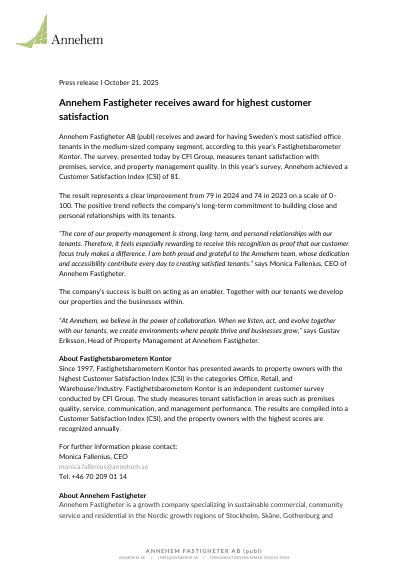 Annehem Fastigheter AB (publ) receives and award for having Sweden's most satisfied office tenants in the medium-sized company segment, according to this year's Fastighetsbarometer Kontor. The survey, presented today by CFI Group, measures tenant satisfaction with premises, service, and property management quality. In this year's survey, Annehem achieved a Customer Satisfaction Index (CSI) of 81.