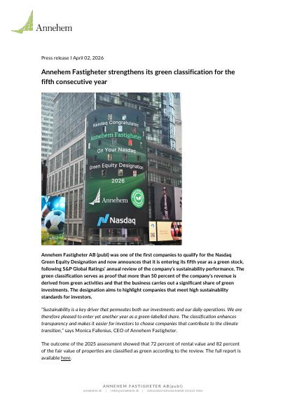 Annehem Fastigheter AB (publ) was one of the first companies to qualify for the Nasdaq Green Equity Designation and now announces that it is entering its fifth year as a green stock, following S&P Global Ratings' annual review of the company's sustainability performance. The green classification serves as proof that more than 50 percent of the company's revenue is derived from green activities and that the business carries out a significant share of green investments. The designation aims to highlight companies that meet high sustainability standards for investors.