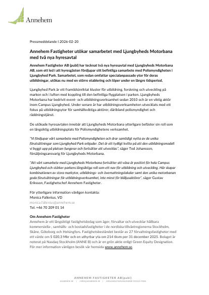 Annehem Fastigheter AB (publ) har tecknat två nya hyresavtal med Ljungbyheds Motorbana AB, som ett led i att hyresgästen fördjupar sitt befintliga samarbete med Polismyndigheten i Ljungbyhed Park. Samarbetet, som redan omfattar specialanpassade ytor för deras utbildningar, utökas nu med en större etablering och löper under en längre tidsperiod.