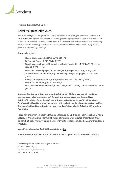 Denna information är sådan information som Annehem Fastigheter AB (publ) är skyldigt att offentliggöra enligt EU:s marknadsmissbruksförordning samt lagen om värdepappersmarknaden. Informationen lämnades, genom ovanstående kontaktpersons försorg, för offentliggörande den 12 februari 2026 kl. 08.00 CET.