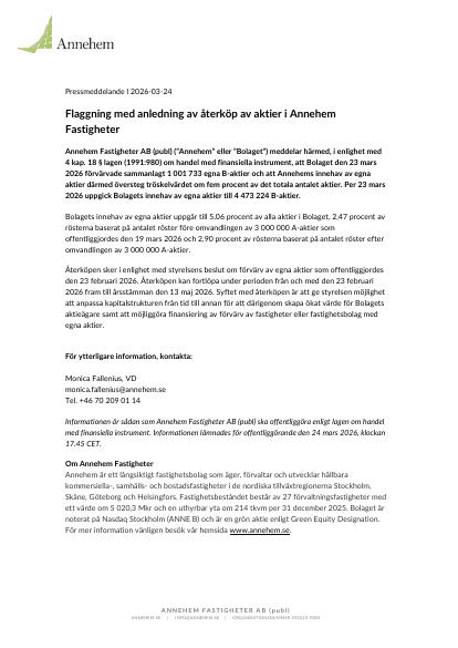 Annehem Fastigheter AB (publ) ("Annehem" eller "Bolaget") meddelar härmed, i enlighet med 4 kap. 18 § lagen (1991:980) om handel med finansiella instrument, att Bolaget den 23 mars 2026 förvärvade sammanlagt 1 001 733 egna B-aktier och att Annehems innehav av egna aktier därmed översteg tröskelvärdet om fem procent av det totala antalet aktier. Per 23 mars 2026 uppgick Bolagets innehav av egna aktier till 4 473 224 B-aktier.