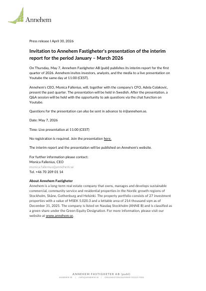 On Thursday, May 7, Annehem Fastigheter AB (publ) publishes its interim report for the first quarter of 2026. Annehem invites investors, analysts, and the media to a live presentation on Youtube the same day at 11:00 (CEST).