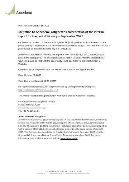 On Thursday, October 23, Annehem Fastigheter AB (publ) publishes its interim report for the period January - September 2025. Annehem invites investors, analysts, and the media to a live presentation on Youtube the same day at 11:00 (CEST).