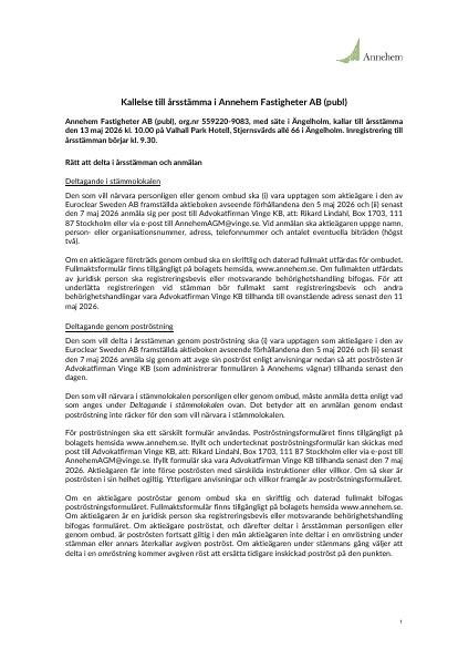 Annehem Fastigheter AB (publ), org.nr 559220-9083, med säte i Ängelholm, kallar till årsstämma den 13 maj 2026 kl. 10.00 på Valhall Park Hotell, Stjernsvärds allé 66 i Ängelholm. Inregistrering till årsstämman börjar kl. 9.30.