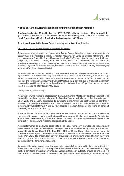 Annehem Fastigheter AB (publ), Reg. No. 559220-9083, with its registered office in Ängelholm, gives notice of the Annual General Meeting to be held on 13 May 2026 at 10 a.m. at Valhall Park Hotel, Stjernsvärds allé 66 in Ängelholm. Registration starts at 9.30 a.m.