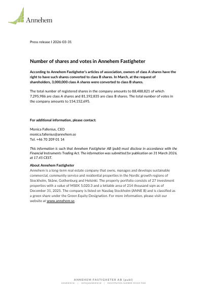 This information is such that Annehem Fastigheter AB (publ) must disclose in accordance with the Financial Instruments Trading Act. The information was submitted for publication on 31 March 2026, at 17.45 CEST.