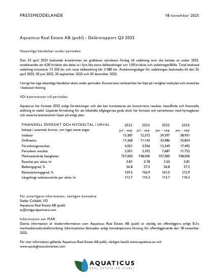 Denna information är insiderinformation som Aquaticus Real Estate AB (publ) är skyldig att offentliggöra enligt EU:s marknadsmissbruksförordning. Informationen lämnades, enligt kontaktpersons försorg, för offentliggörande den 18 november 2025.